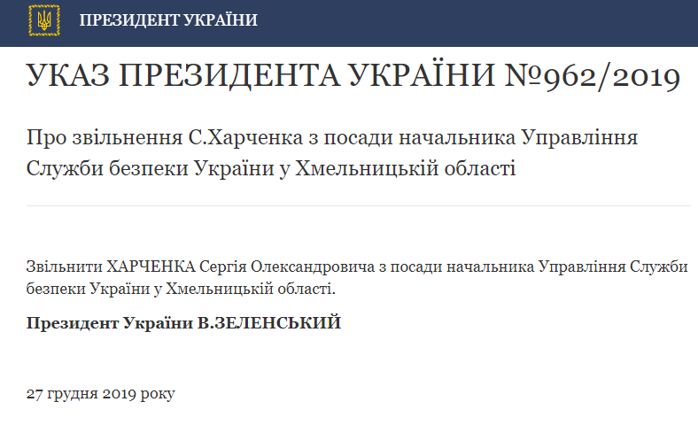"Уволить Харченко Сергея Александровича от должности начальника Управления Службы безопасности Украины в Хмельницкой области", - говорится в тексте указа №962/2019.
