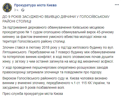 "Преступление произошло в феврале 2018 в подъезде жилого дома по ул. Лятошинского. Находясь на 7 этаже дома между обвиняемым и потерпевшей возник конфликт, в ходе которого злоумышленник начал душить женщину, в связи с чем последняя погибла на месте от механической асфиксии", - говорится в сообщении.