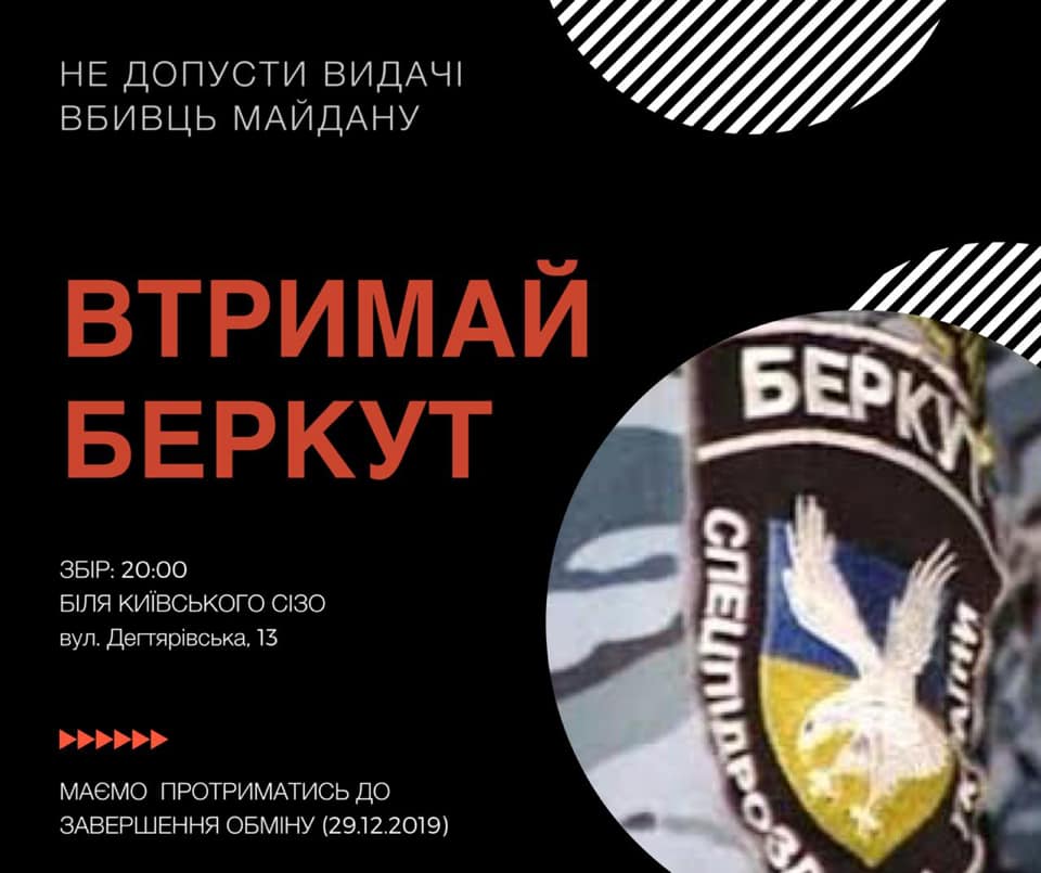 19:29  Порохоботы и националисты собирают акцию протеста под СИЗО, чтобы не допустить отправки беркутовцев на обмен. Вот такие постеры уже распространяются в соцсетях.