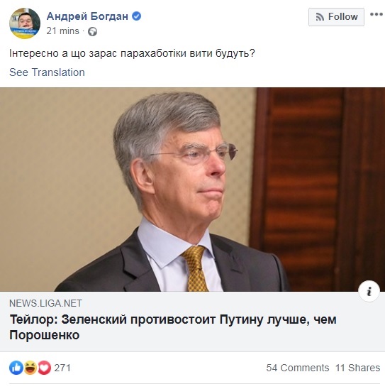 Своей реакцией на высказывание американского дипломата поделился и глава Офиса Президента Андрей Богдан: "Интересно, а что сейчас похоботики выть будут?" - написал Богдан.