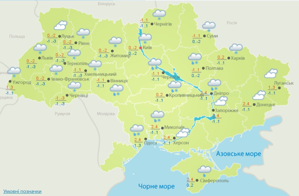 Температура на протяжении суток составит от 3° мороза до 2° тепла. Днем ​​в южной части страны, а также в Донецкой и Днепропетровской областях 1-5° тепла; на высокогорье Карпат на протяжении суток 7-11° мороза.