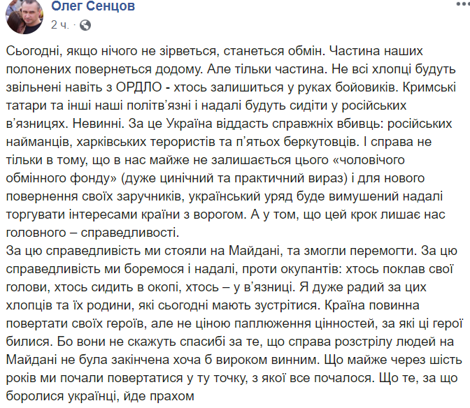 14:11  Бывший заключенный Олег Сенцов, обменянный недавно Зеленским, осудил обмен. Говорит, что все, за что боролись на Майдане, идет прахом.