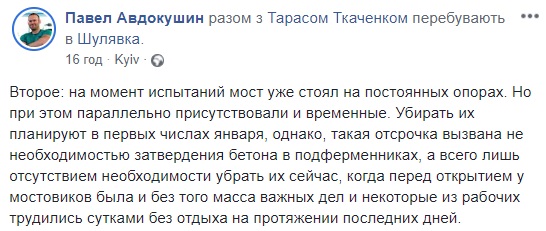 А блогер Павел Авдокушин сообщил, что убирать временные деревянные опоры руководство города планирует в первых числах января. "...такая отсрочка вызвана не необходимостью затвердения бетона в подферменниках, а всего лишь отсутствием необходимости убрать их сейчас, когда перед открытием у мостовиков была и без того масса важных дел и некоторые из рабочих трудились сутками без отдыха на протяжении последних дней", - пишет пользователь.