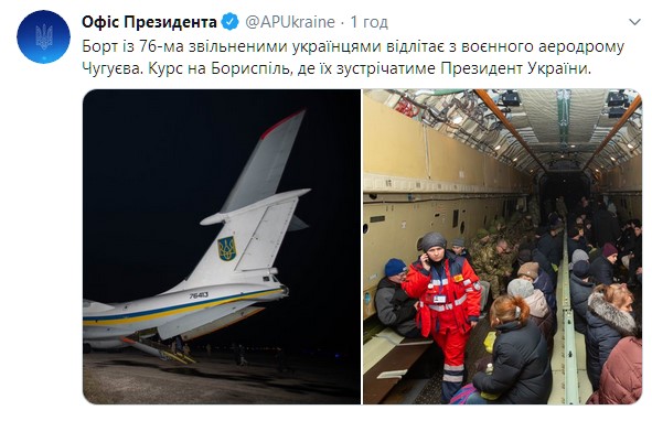 "Борт с 76-ю освобожденными украинцами вылетает с военного аэродрома Чугуева. Курс на Борисполь, где их будет встречать президент Украины", - говорится в сообщении.