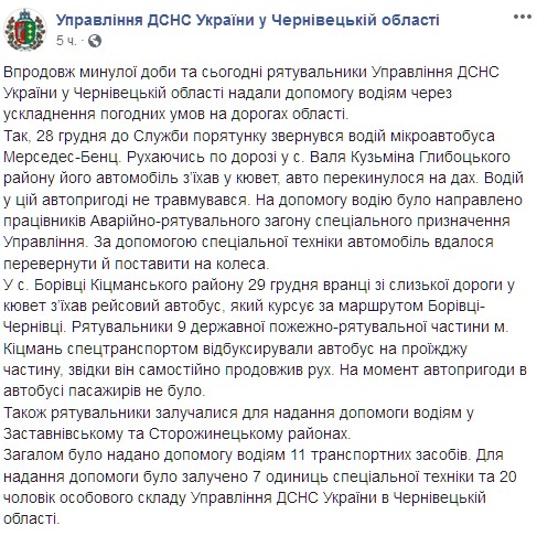 "На протяжении прошлых суток и сегодня спасатели Управления ГСЧС Украины в Черновицкой области оказали помощь водителям из-за осложнения погодных условий на дорогах области. Так, в селе Боривцы Кицманского района 29 декабря утром со скользкой дороги в кювет съехал рейсовый автобус, который курсирует по маршруту Боривцы-Черновцы", - говорится в сообщении.