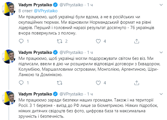 Министр иностранных дел Украины Вадим Пристайко подвел итоги года, рассказав про освобождение пленных с ОРДЛО, расширение перечня стран, куда украинцы могут ездить без виз, изменение правил поездок в Россию - по загранпаспортом, расширение штата украинских консулов за границей, работу в международных организациях над доказательствами, что РФ нарушает права человека, а также движение Украины вперед ради мира. Об этом он написал в Twitter.