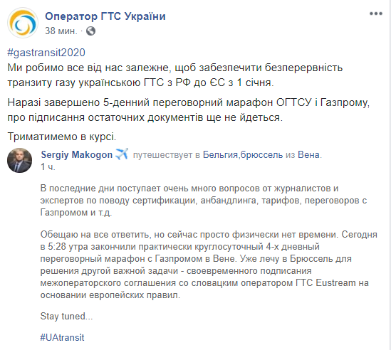 Напомним, генеральный директор ООО "Оператор ГТС Украины" Сергей Макогон сообщил, что переговоры длились круглосуточно почти 4 дня и завершились 30 декабря в 5:28 (6:28 по Киеву).