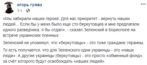 Слова Зеленского прокомментировал главный редактор "Страны" Игорь Гужва: "Зеленский не упомянул, что "беркутовцы" - это тоже граждане Украины. То есть получается, что для Зеленского одни украинцы - это "наши люди". А другие украинцы (беркутовцы) - это просто "обменный фонд", за счёт которого будут освобождать "наших людей".