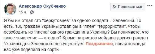"То есть, 100 граждан Украины отдал бы в "плен" "террористам", чтобы освободить из "плена" одного гражданина Украины? Вы понимаете, что такое заявление — это дно? Кроме патриотов майдана других граждан Украины для Зеленского не существует. Поздравляю, новая команда нас уже поделила на сорты".
