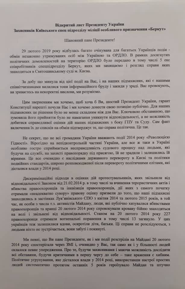 В нем они назвали слова президента некорректными. И призвали президента прислушаться не только к той Украине, которая проклинает обмен беркутовцев - но и к другой ее части, в которой многие голосовали за Зеленского.