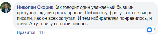 "Как говорит один уважаемый бывший прокурор: відкрив рота- пропав. Люблю эту фразу. Так все вчера писали, как он всех запутал. И тем избирателям понравилось, и этим. А тут сразу все выяснилось", - прокомментировал заявление Зе нардеп Николай Скорик.