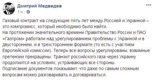 Премьер-министр России Дмитрий Медведев заявил, что газовый контракт между Россией и Украиной является компромиссом, к которому необходимо было прийти. Об этом он написал у себя в Facebook.
