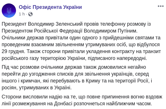 Президент Украины Владимир Зеленский и президент России Владимир Путин договорились перейти к согласованию списков для освобождения украинцев, в том числе и крымчан, которые находятся в Крыму и на территории России. Об этом говорится в сообщении Офиса Президента в Facebook.
