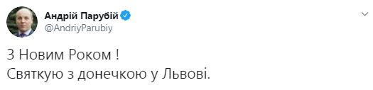 Так, бывший спикер Верховной Рады Андрей Парубий праздновал Новый год во Львове с дочкой. Об этом он рассказал в Twitter и выложил совместное фото с Яриной.