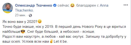 Нардеп от "Слуги народа", глава Комитета по вопросам гуманитарной и информационной политики Александр Ткаченко обещает, что в этом году "все будет иначе, чем в 2019". "Радости вам навстречу, а любовь - пусть вас окутывает. Уюта и благополучия вашему дому. Успехов всем нам. Пусть будет так", - написал он в Facebook.