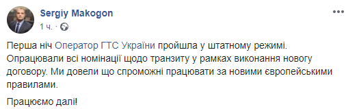 "Мы уже транспортировали в ЕС первые кубометры газа по новому транзитному контракту, отныне уже по европейским правилам в межгосударственных точках, ГТС работает в штатном режиме", - говорится в сообщении.