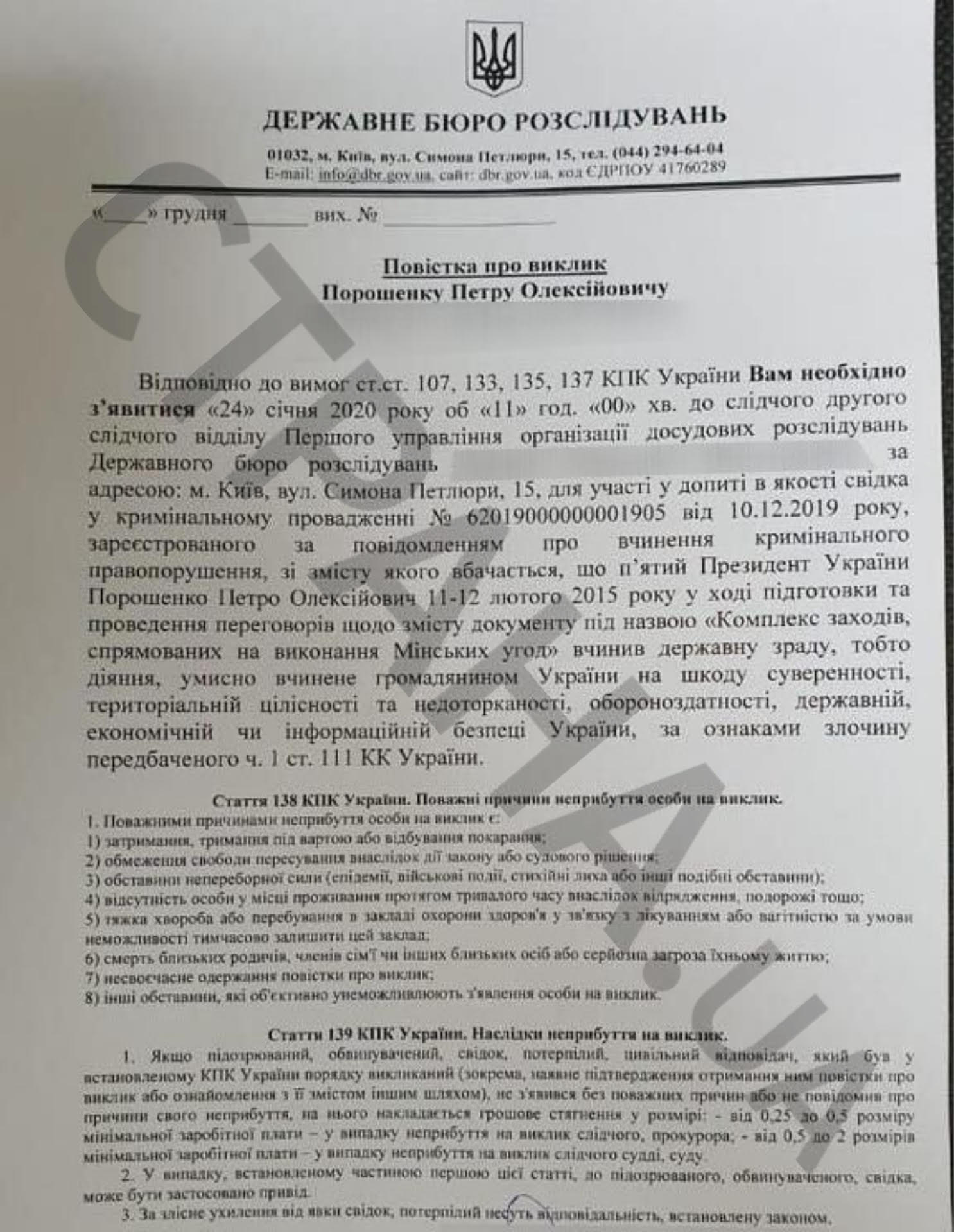 В повестке для бывшего президента, которая оказалась в нашем распоряжении, кратко описана фабула преступления, в котором подозревается Порошенко: "пятый президент Украины Порошенко Петр Алексеевич 11-12 февраля 2015 года в ходе подготовки проведения переговоров по содержанию документа под названием "Комплекс мер, направленных на выполнение Минских соглашений" совершил государственную измену, то есть деяния, умышленно совершенные гражданином Украины в ущерб суверенности, территориальной целостности, обороноспособности, государственной, информационной и экономической безопасности Украины, с признаками преступления, предусмотренного ч.1 ст.111 УК Украины".