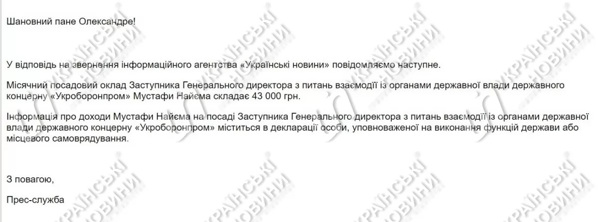 "Месячный должностной оклад заместителя генерального директора по вопросам взаемодействия с органами государственной власти государственного концерна "Укроборонпром" Мустафы Найема составляет 43 000 гривен. Информация о доходах Мустафы Найема на должности заместителя генерального директора по вопросам взаемодействия с органами государственной власти государственного концерна "Укроборонпром" содержится в декларации лица, уполномоченного на выполнение функций государства или местного самоуправления", - сказано в ответе.