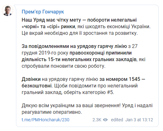 С 27 декабря украинские правоохранители пресекли деятельность 15 нелегальных игорных заведений, которые попытались восстановить свою работу. Об этом в своем телеграм-канале сообщил премьер-министр Алексей Гончарук.