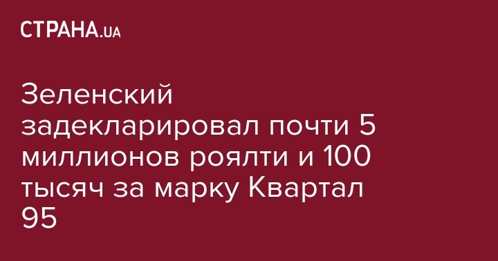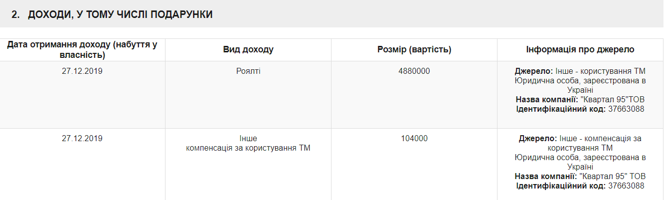Президент Украины Владимир Зеленский задекларировал полученные 27 декабря 2019 года 4 млн 880 тыс. грн роялти и 104 тыс. грн компенсации за использование торговой марки от ООО "Квартал 95".