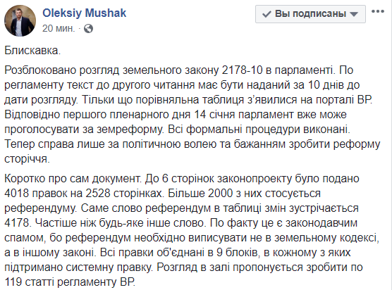 "К 6 страницам законопроекта было подано 4018 поправок на 2528 страницах. Более 2000 из них касается референдума. Само слово "референдум" в таблице встречается 4178 раз. Чаще чем любое другое слово. ...  Все правки объединены в 9 блоков, в каждом из которых поддержана системная правка", - написал экс-нардеп от Блока Порошенко на своей странице в Facebook.