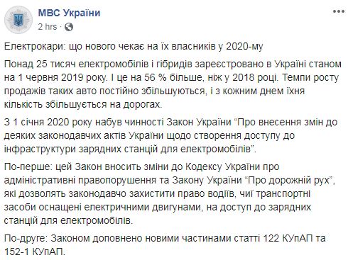 Во-первых: это закон вносит изменения в Кодекс Украины об административных правонарушениях и Закон Украины "О дорожном движении", которые позволят законодательно защитить право водителей, чьи транспортные средства оснащены электрическими двигателями, на доступ к зарядных станциям для электромобилей.