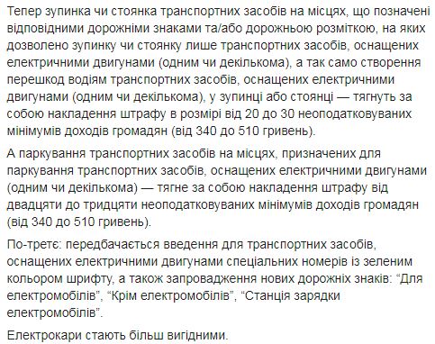 Теперь остановка или стоянка транспортных средств на местах, обозначенных соответствующими дорожными знаками и/или дорожной разметкой, на которых разрешена остановка или стоянка только транспортных средств, оснащенных электрическими двигателями (одним или несколькими), а так же создание препятствий водителям транспортных средств, оснащенных электрическими двигателями (одним или несколькими), в остановке или стоянке - влекут за собой наложение штрафа в размере от 20 до 30 необлагаемых минимумов доходов граждан (от 340 до 510 гривен).