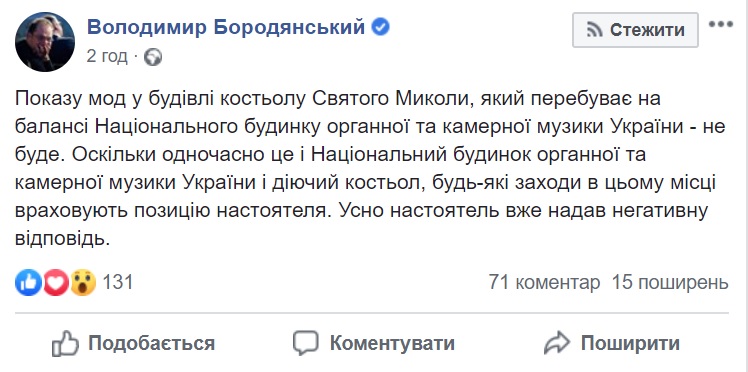 "Показа мод в здании костела Святого Николая, который находится на балансе Национального дома органной и камерной музыки Украины - не будет. Поскольку одновременно это и Национальный дом органной и камерной музыки Украины и действующий костел, любые мероприятия в этом месте учитывают позицию настоятеля. Устно настоятель уже предоставил отрицательный ответ", - говорится в посте.