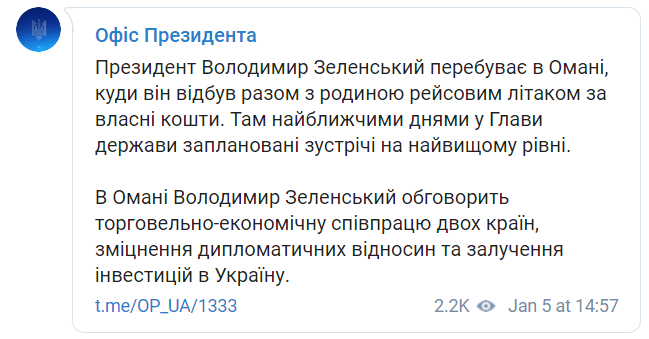"Президент Владимир Зеленский находится в Омане, куда он отбыл вместе с семьей рейсовым самолетом за собственные средства. Там в ближайшие дни у главы государства запланированы встречи на высшем уровне", - заявили в пресс-службе Офиса Президента (ОП).