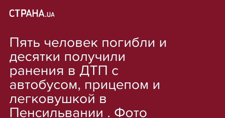 "Вследствие массового ДТП с участием тракторных прицепов, автобуса и легковых автомобилей погибли пять человек, еще, по меньшей мере, 60 человек получили повреждения в западной части Пенсильвании в воскресенье утром", - говорится в сообщении.