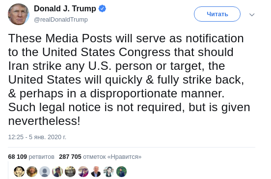 "Этот пост для медиа будет служить уведомлением Конгресса США о том, что если Иран нанесет удар по любому лицу или цели США, Соединенные Штаты быстро и полностью нанесут ответный удар, и, возможно, непропорционально. Такое официальное уведомление не требуется, но, тем не менее, оно предоставляется!", - написал Трамп.