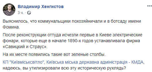 В Киеве в Ботаническом саду имени Фомина исчезли первые в городе электрические фонари. Они были установлены еще в 1890-х годах компанией Савицкий и Страус. Теперь исторически ценные фонари заменили на современные. Об этом на своей странице в Facebook написал урбанист, журналист издания Хмарочос Владимир Хенгистов.