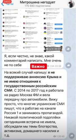 Также она отметила, что ей не по себе после встречи. И важным выделила следующее: "я не поддерживаю аннексию Крыма и не имею отношения к государственным российским СМИ. С 2014 по 2017 год я работала на радио Москва ФМ и вела передачу про автомобили. Вижу просто, что многие украинские СМИ пишут, что я работала на канале Россия 1 и занималась пропагандой. Никакой политической подоплеки сегодняшняя встреча не имела, обсуждали мы темы блогерства, активизма, домашнего насилия и т.д".