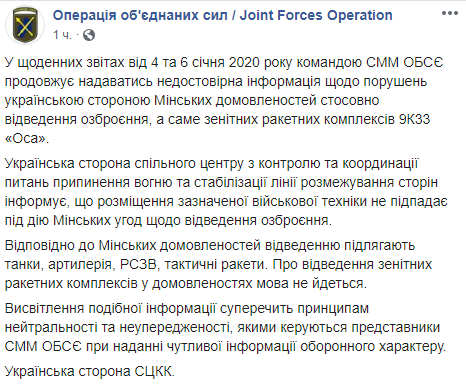 В отчете СММ ОБСЕ от 4 января 2020 года сообщается, что среди вооружения, размещенного с нарушением линий разведения на подконтрольных Украине территориях зафиксировали буксированную гаубицу "Жаба" (Д-30, 122 мм) - возле населенного пункта Пищевик в Донецкой области. А также два зенитно-ракетных комплекса "Оса" - возле населенных пунктов Спорное (Донецкая область) и Окнино (Луганская область)".