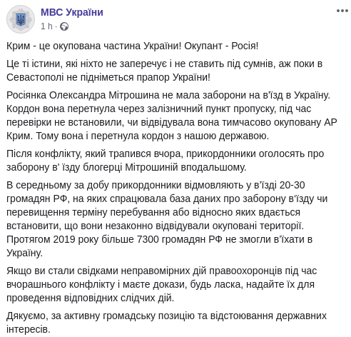 В результате конфликта, который возник 6 декабря на встрече Митрошиной с подписчиками в Киеве, было установлено, что россиянка посещала оккупированный полуостров в 2017 году, въехав с территории России.