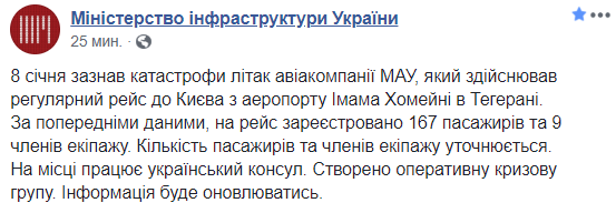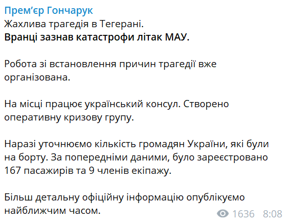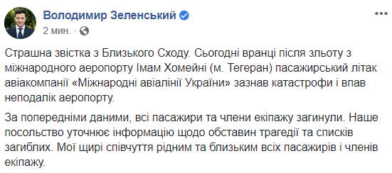 "Страшная весть с Ближнего Востока. Сегодня утром после взлета из международного аэропорта Имам Хомейни (г. Тегеран) пассажирский самолет авиакомпании "Международные авиалинии Украины" потерпел катастрофу и упал недалеко от аэропорта.