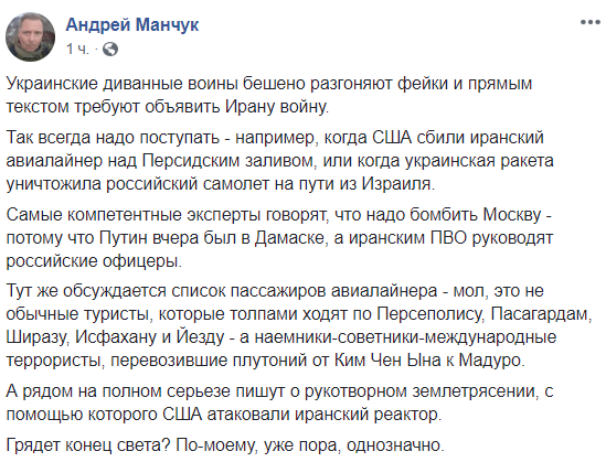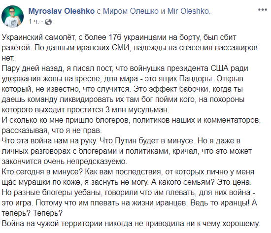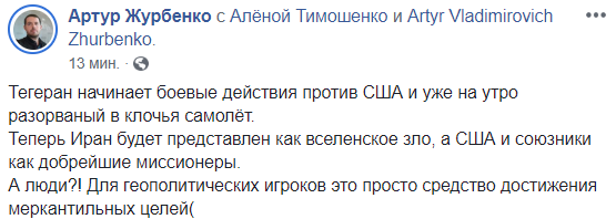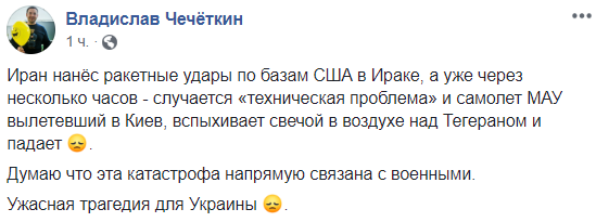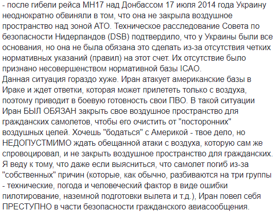 "Ужасная история с падением Boeing 737-800, особенно учитывая параллельный ракетный обстрел Ираном военной базы в США и закрытие американцами воздушного пространства над Ираном и Ираком, выглядит подозрительно",  -пишет Арьев.