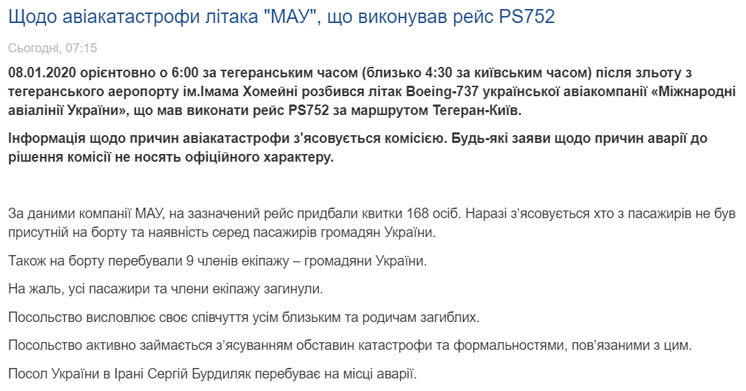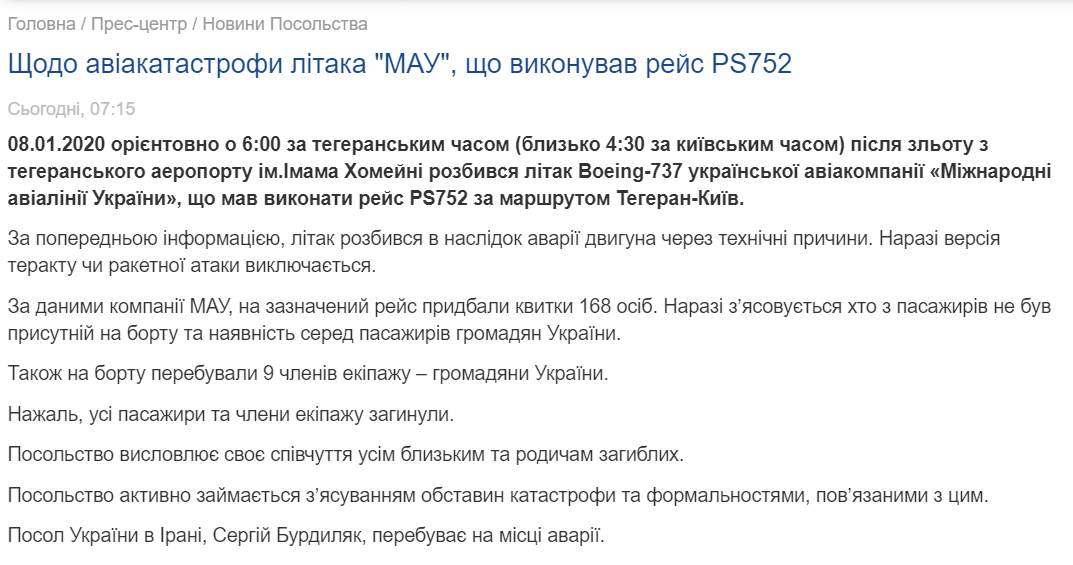 12:20  На сайте посольства Украины в Иране появился отредактированный текст о катастрофе. Там уже нет слов о том, что это не теракт и не ракета.