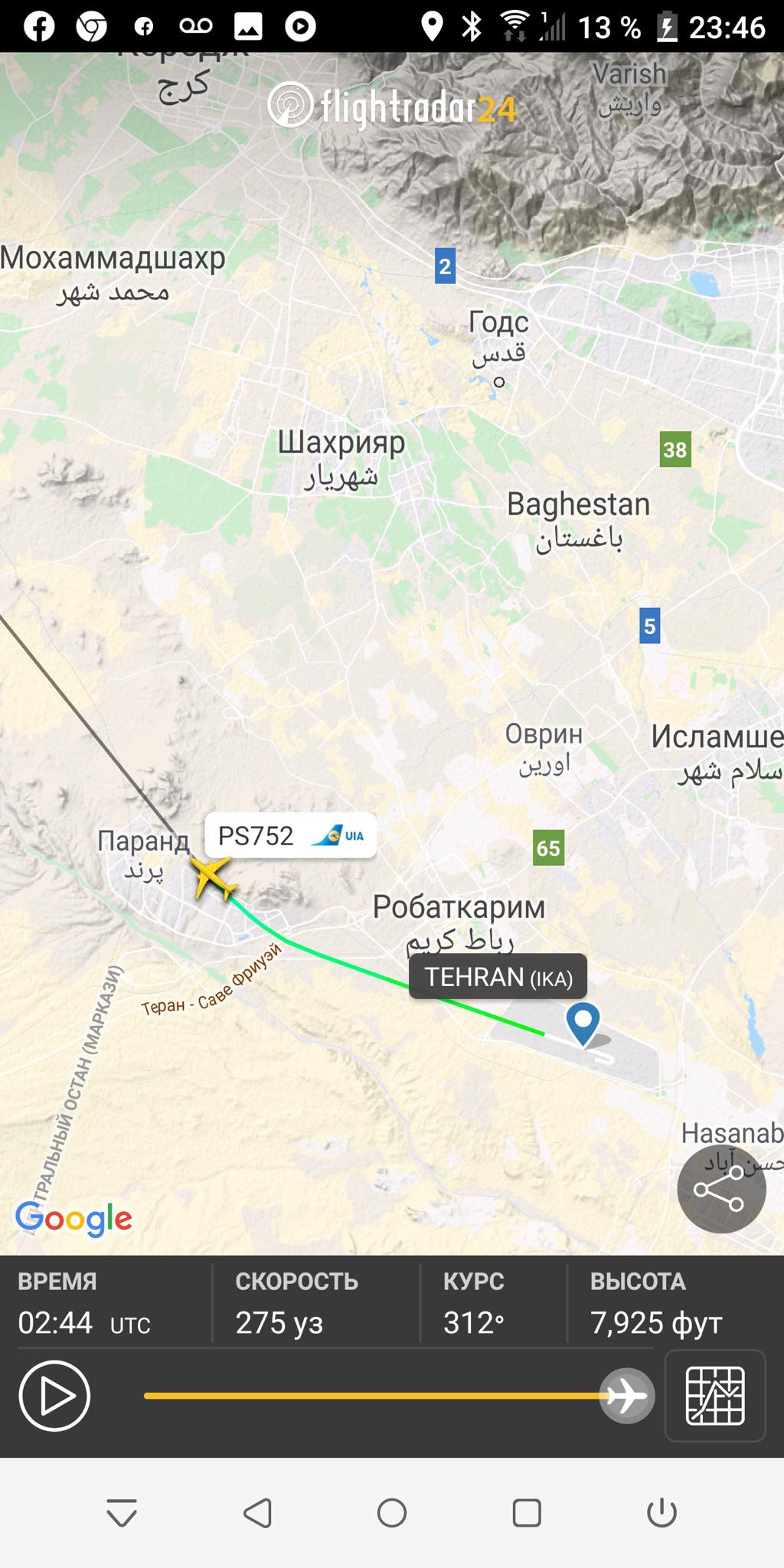 7:00  Маршрут украинского "Боинга" из Тегерана до точки падения.