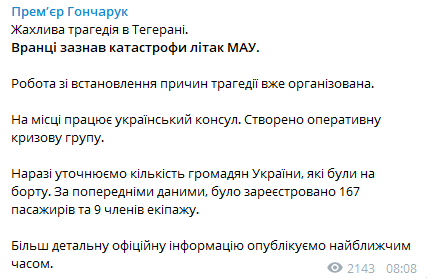 "Ужасная трагедия в Тегеране. Утром потерпел катастрофу самолет МАУ. Работа по установлению причин трагедии уже организована. На месте работает украинский консул. Создана оперативная кризисную группу", – написал премьер-министр в Телеграм-канале утром в среду.