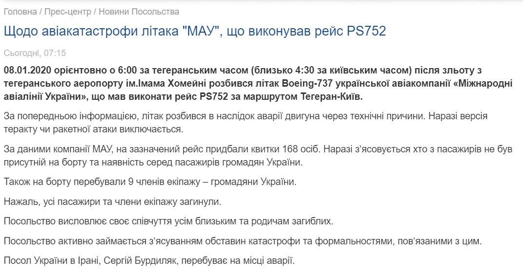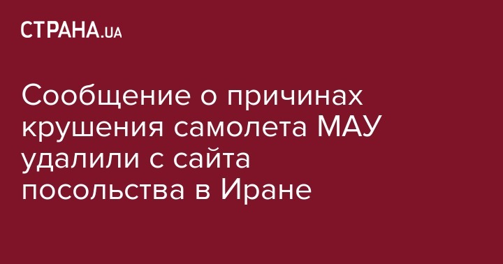 Посольство Украины в Иране убрало со своего сайта новость, в которой говорится, что ни теракт, ни ракета не виноваты в падении самолета Boeing 737 украинской авиакомпании МАУ, который летел из Тегерана в Киев.