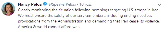 Спикер палаты представителей в США Ненси Пелоси заявила, что администрация президента Дональда Трампа провоцирует начало новой войны после событий в Ираке. Об этом она сообщила в Twitter.