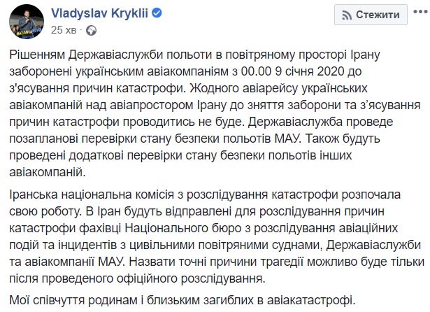 "Решением Госавиаслужбы полеты в воздушном пространстве Ирана запрещены украинским авиакомпаниям с 00.00 9 января 2020 до выяснения причин катастрофы. Ни одного авиарейса украинских авиакомпаний над авиапространством Ирана до снятия запрета и выяснения причин катастрофы проводиться не будет. Госавиаслужба проведет внеплановые проверки состояния безопасности полетов МАУ. Также будут проведены дополнительные проверки состояния безопасности полетов других авиакомпаний", - написал Криклий.