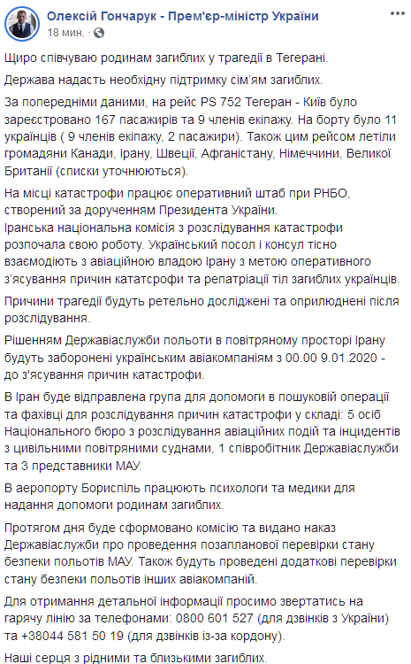 Уточним, что на своей странице в Facebook Гончарук заявил о том, что запрет будет действовать с 00:00 9 января и до выяснения причин катастрофы. При этом он настаивает на участии Украины в расследовании крушения.