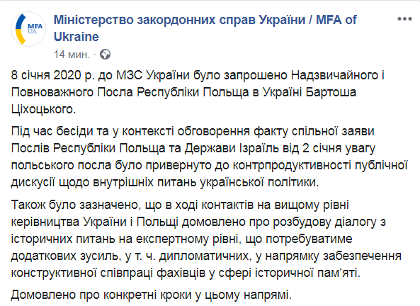Как отметили в пресс-службе МИД, во время беседы с дипломатом и в контексте обсуждения совместного заявления послов Польши и Израиля от 2 января внимание польского чиновника было привлечено к "контрпродуктивности публичной дискуссии по внутренним вопросам украинской политики".