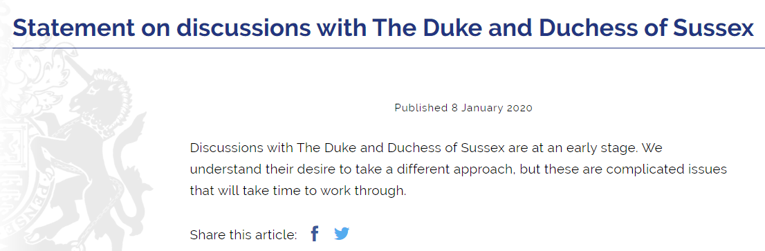 "Обсуждения с герцогом и герцогиней Сассекскими находятся на ранней стадии. Мы понимаем их желание выбрать иной подход, но это сложные проблемы, проработка которых займет время", - сказано на интернет-странице королевского дома.