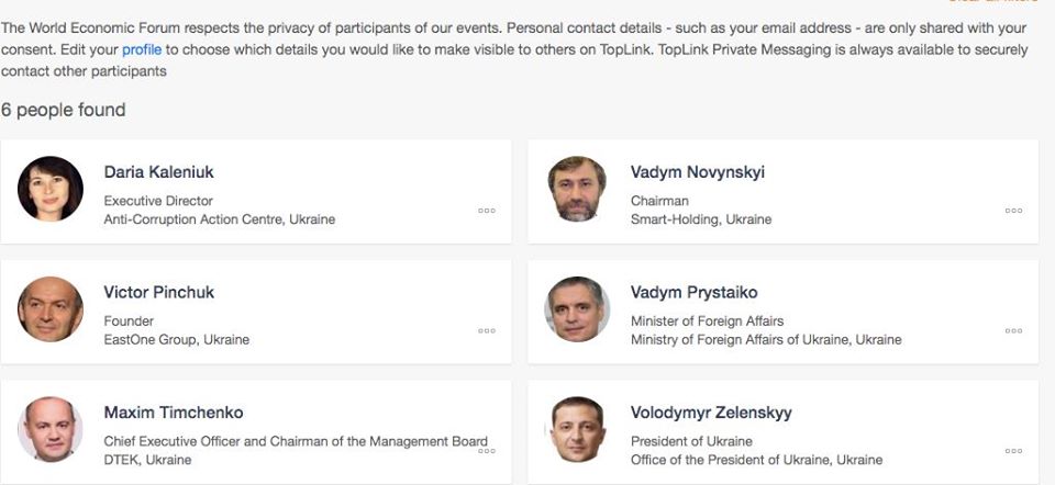 По ее словам, от Украины зарегистрировано шесть участников: президент Украины Владимир Зеленский, министр иностранных дел Вадим Пристайко, олигарх Виктор Пинчук, который ежегодно организует Украинский завтрак в Давосе, нардеп Вадим Новинский, генеральный директор ДТЭК Максим Тимченко и сама Дарья Каленюк.