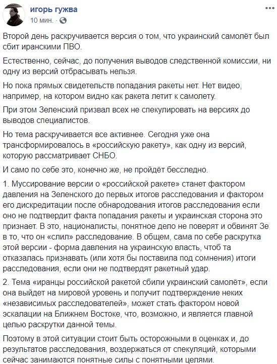 "Второй день раскручивается версия о том, что украинский самолёт был сбит иранскими ПВО.