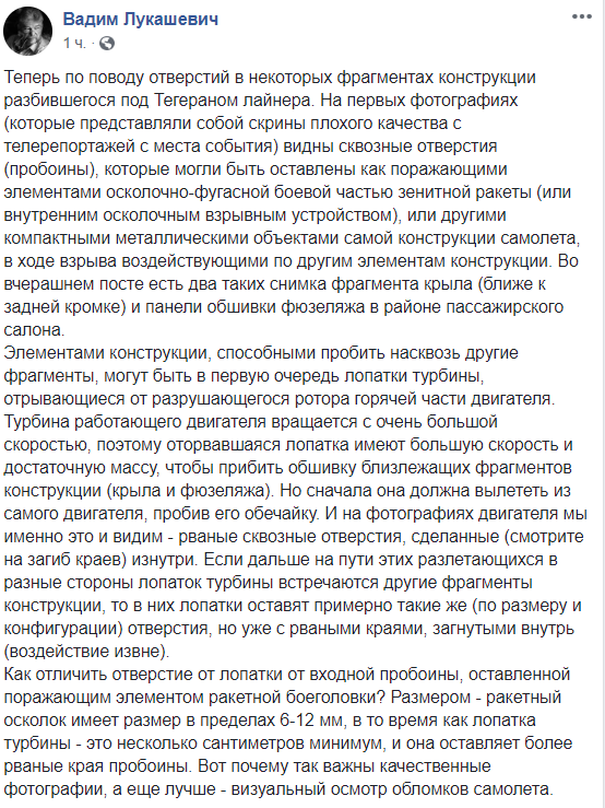Как отличить отверстие от лопатки от входной пробоины, оставленной поражающим элементом ракетной боеголовки? Размером - ракетный осколок имеет размер в пределах 6-12 мм, в то время как лопатка турбины - это несколько сантиметров минимум, и она оставляет более рваные края пробоины. Вот почему так важны качественные фотографии, а еще лучше - визуальный осмотр обломков самолета", - пишет Лукашевич.