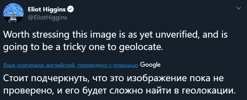 Даже основатель Bellingcat Элиотт Хиггинс заявил, что у фото нет геолокации, поэтому к нему надо относиться с осторожностью.